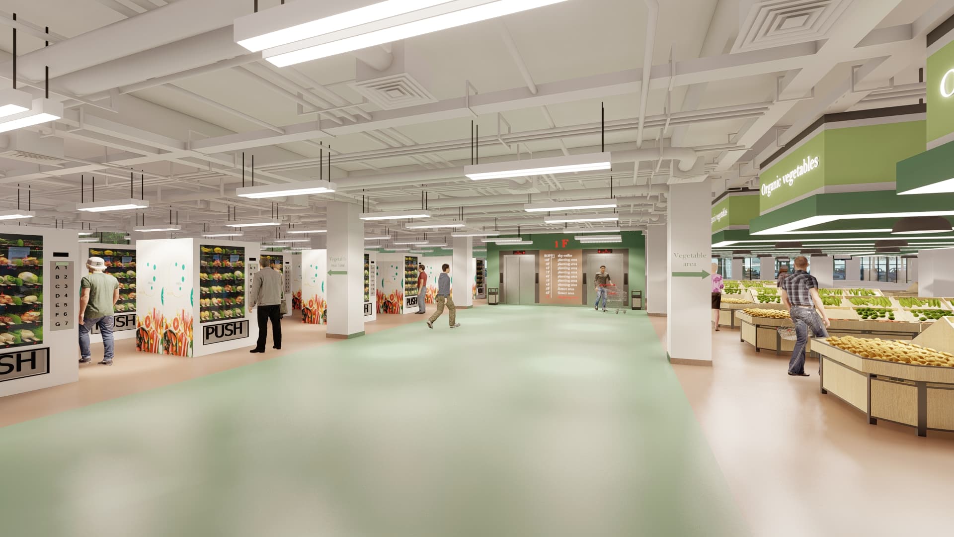 底层的“从农场到餐桌”: 大楼的一楼,我们设立了24小时自动售卖区。楼内新鲜采摘的有机蔬菜会第一时间补充到自动售卖机中,让周边的居民和白领可以随时方便地购买到最新鲜、最健康的本地农产品。