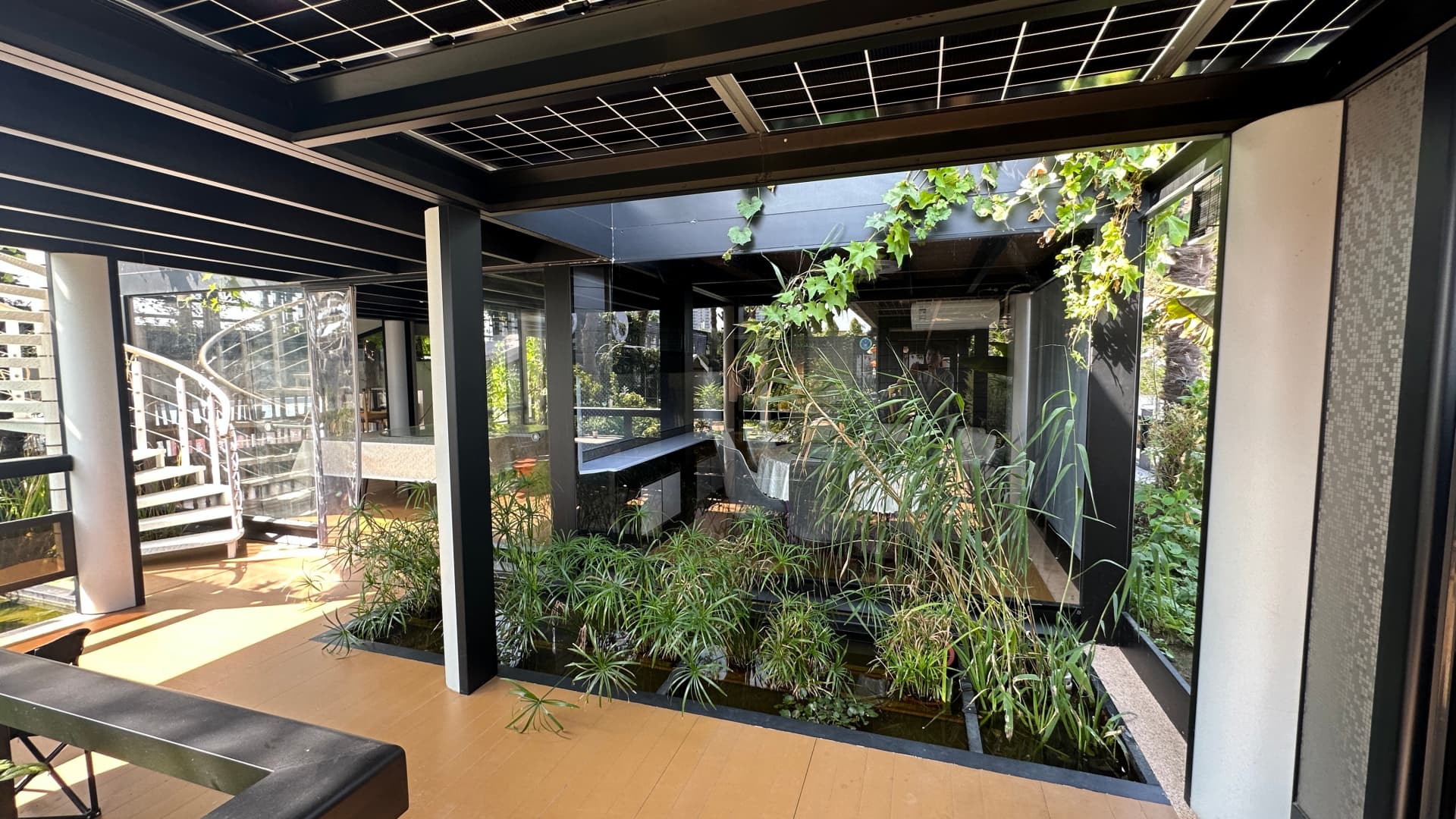 智能的自然遮阳:环绕房间外部的繁茂植物,不仅仅是装饰。它们构成了一道天然的隐私屏障和动态的遮阳系统。在炎炎夏日,浓密的枝叶能有效阻挡阳光直射,降低室内温度,减少空调能耗,这是我们“人类生态学”中最高效、最合理的生态设计。