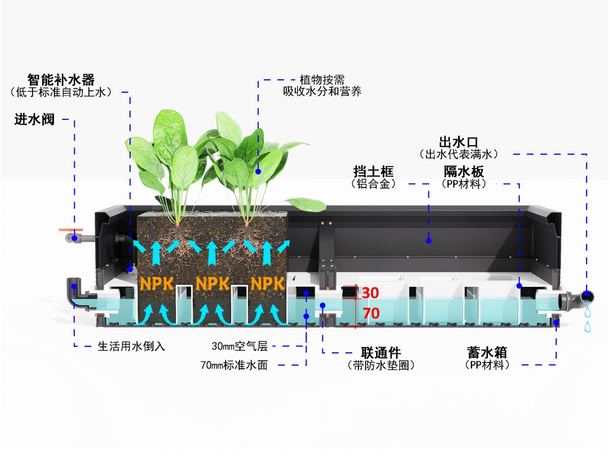 底部蓄水层:箱体底部设有约6-7公分的蓄水空间 ,如同一个微型地下水库,为植物提供稳定长效的水源 。