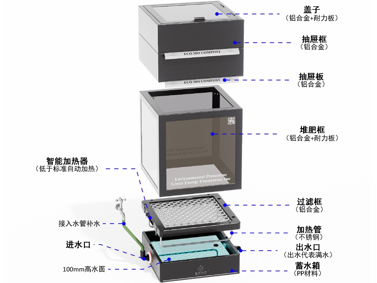 智能温控发酵:内置智能加热器与不锈钢加热管,当环境温度过低时自动启动,维持最佳发酵温度,确保一年四季都能高效分解厨余 。