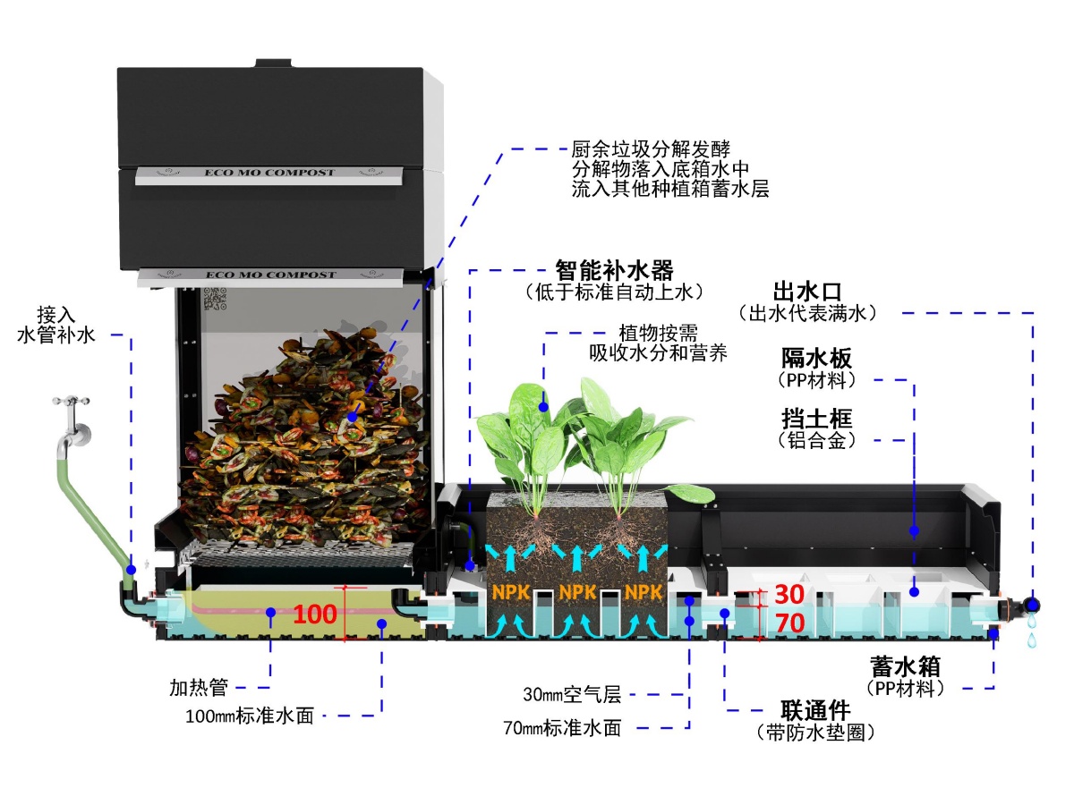 自动化液体施肥:您只需将剩饭剩菜等厨余垃圾投入箱中 。经过分解发酵,富含养分的有机液体肥料会直接渗入下方的蓄水箱,并通过连通的水网,自动、均匀地输送至每一个与之相连的种植箱,滋养所有植物 。